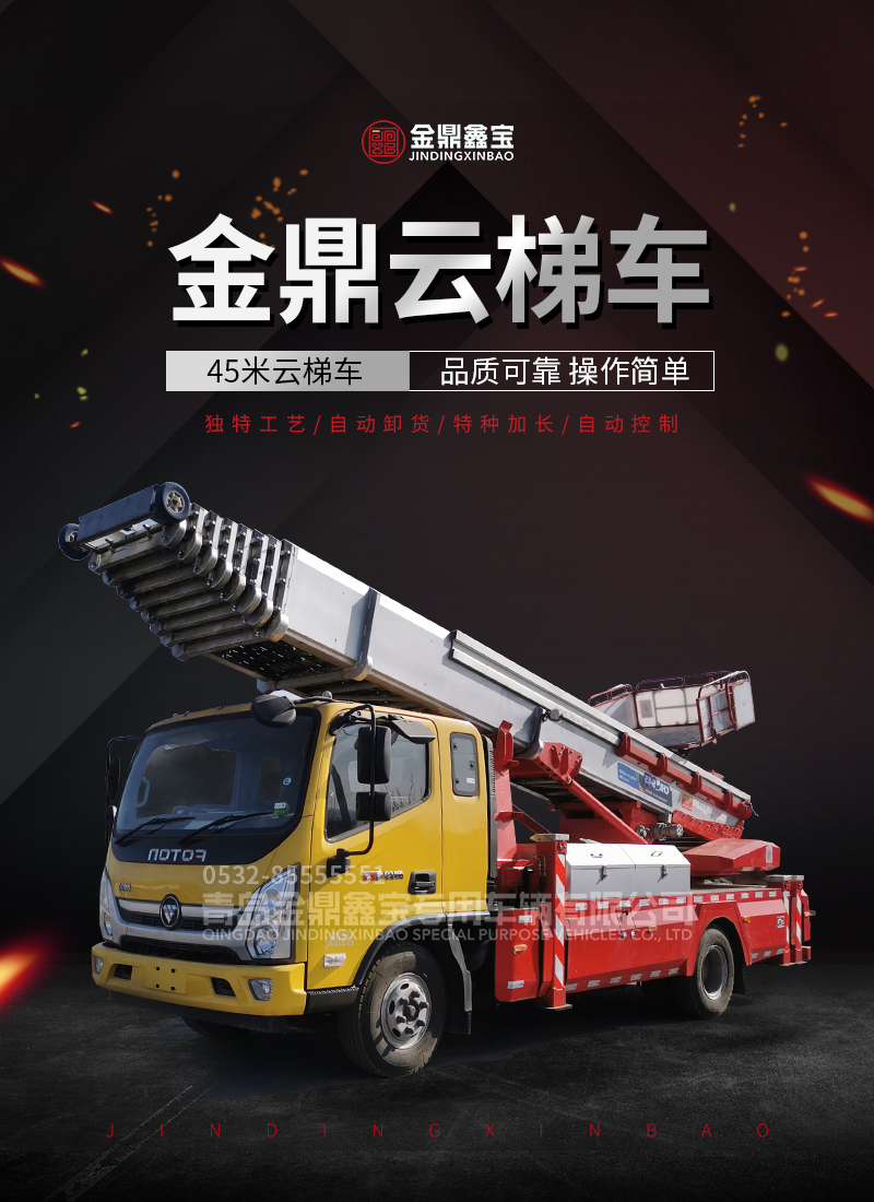 作業範圍可達45米高,青島金鼎鑫寶雲梯車整體采用韓國原裝進口梯臂,最大承載貨物重量400公斤。